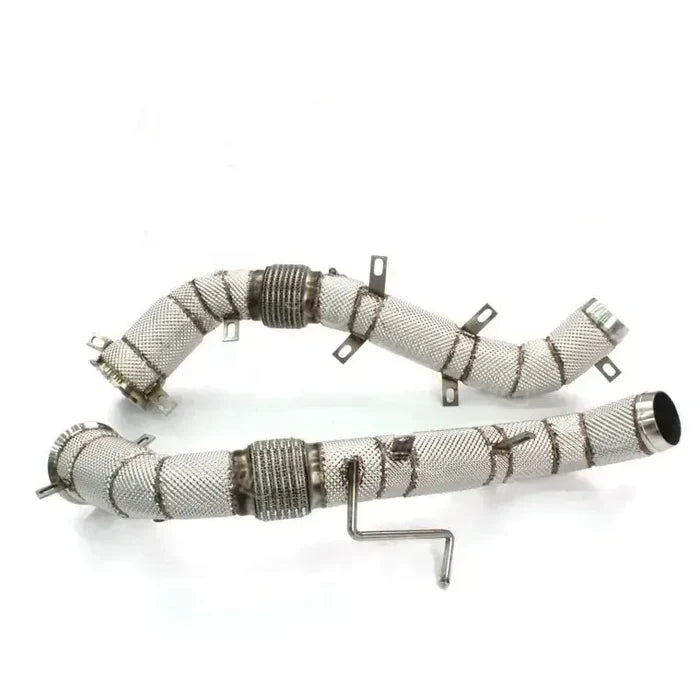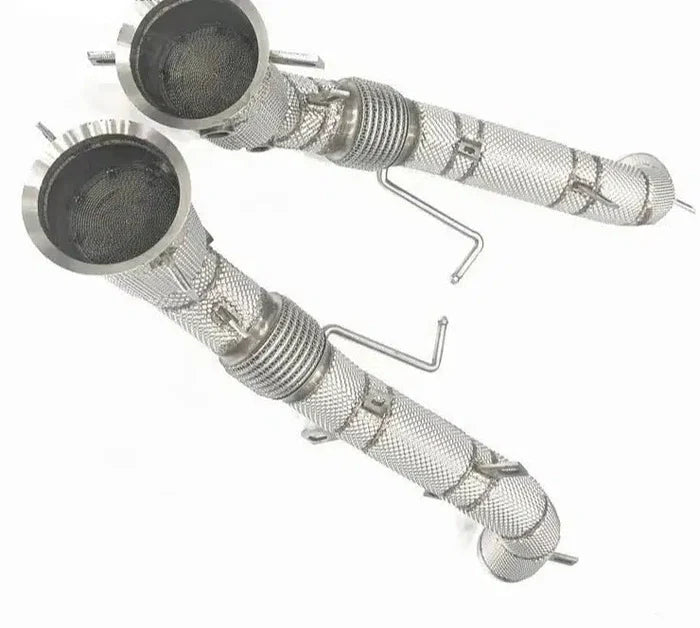 Enhance the performance of your McLaren 570S or 570GT with full catless downpipes featuring integrated heat shields. Engineered for maximum airflow and power, these downpipes provide sharper throttle response, increased horsepower, and a more aggressive exhaust note.